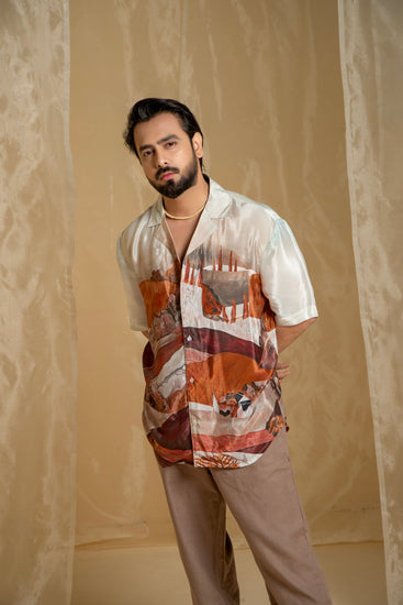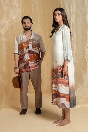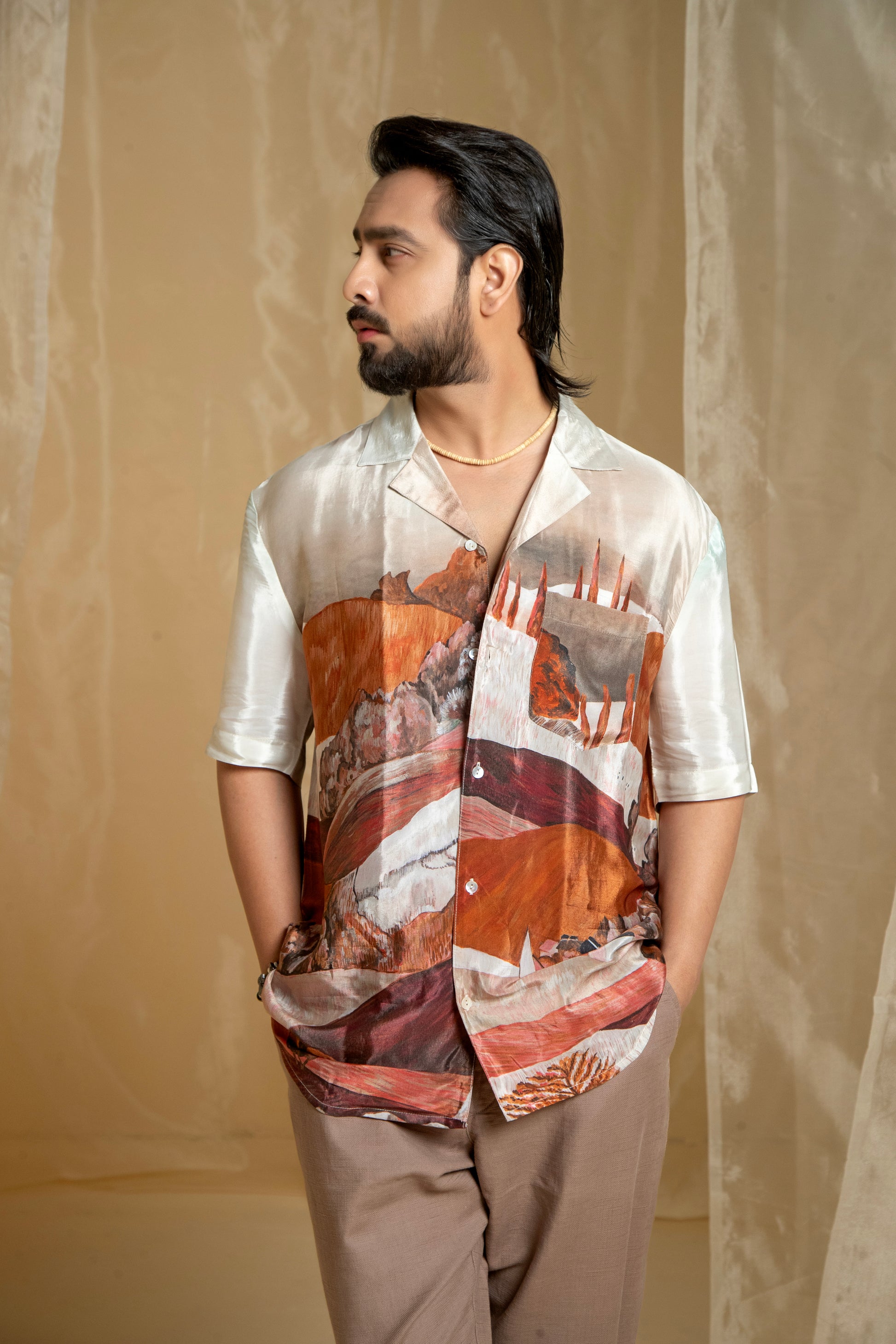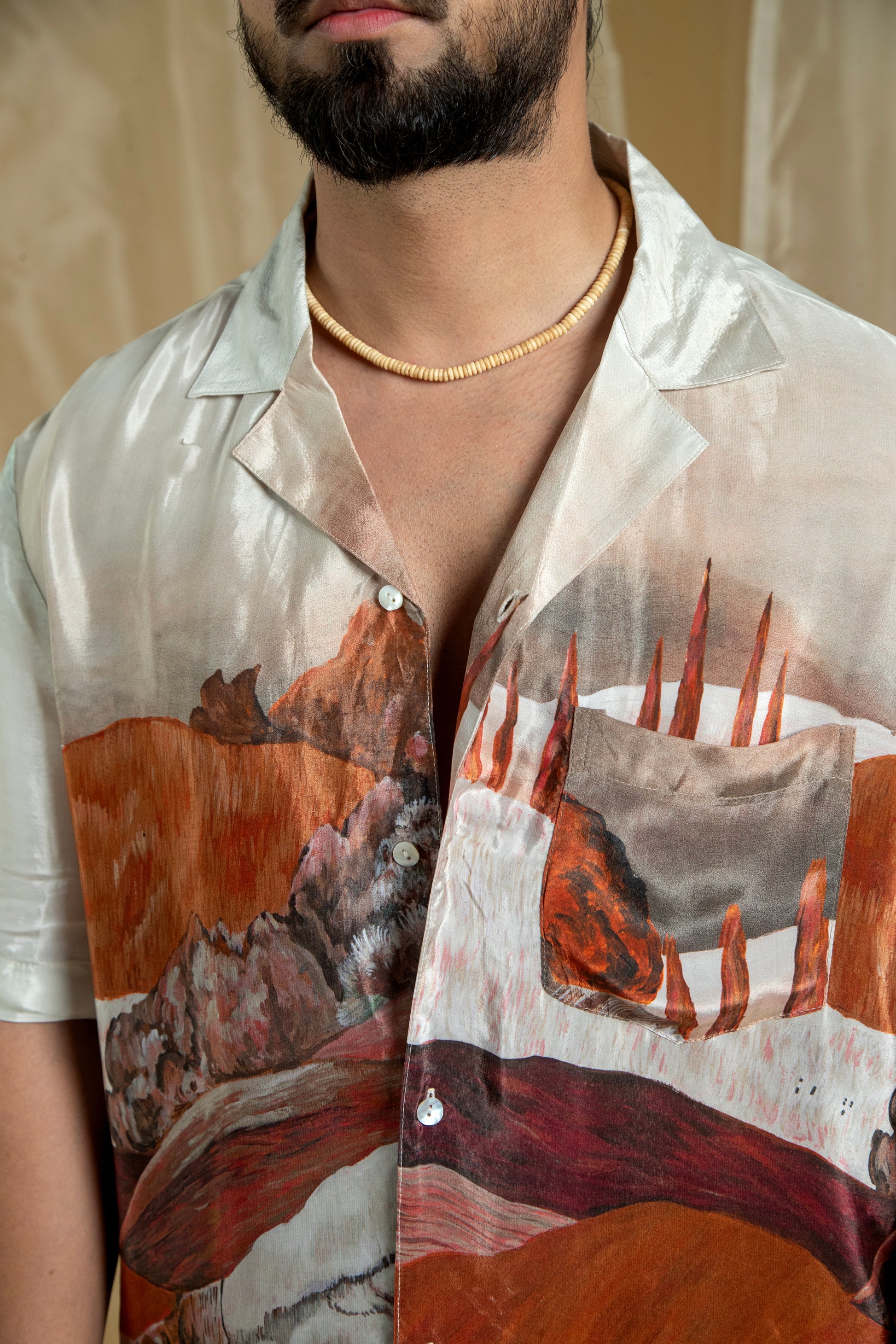 For men, the Lovescape Mountain Print Shirt captures the majestic beauty of mountain landscapes in rich colors, offering a lightweight, breathable fit thanks to its pure natural crepe fabric. With its short sleeves and artistic design, it’s the ideal choice for both casual and semi-formal occasions, seamlessly blending comfort with elegance.