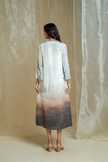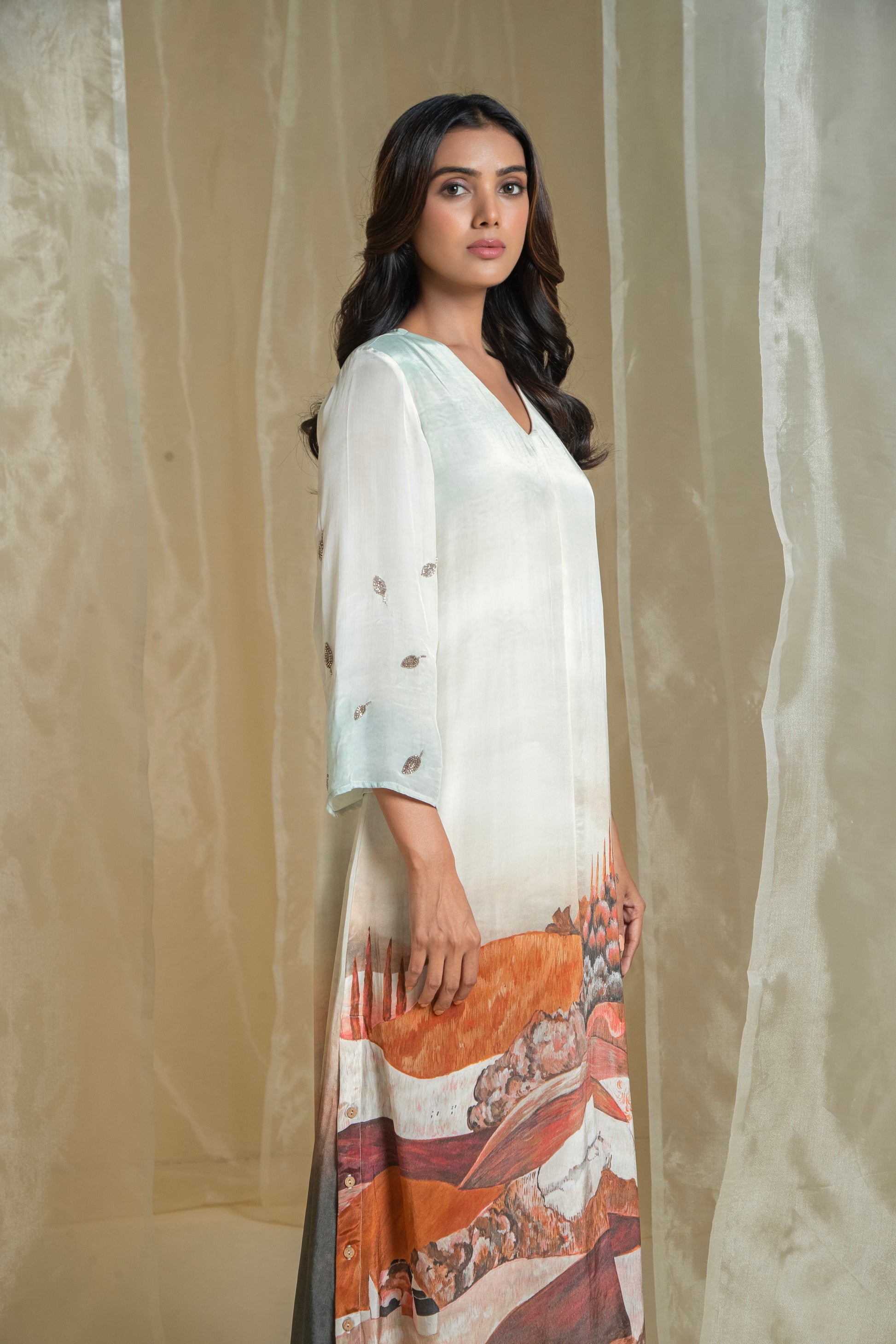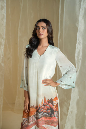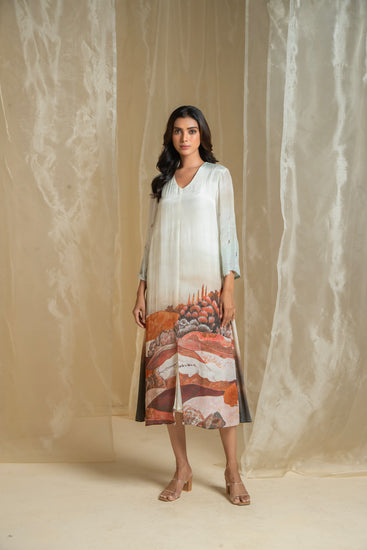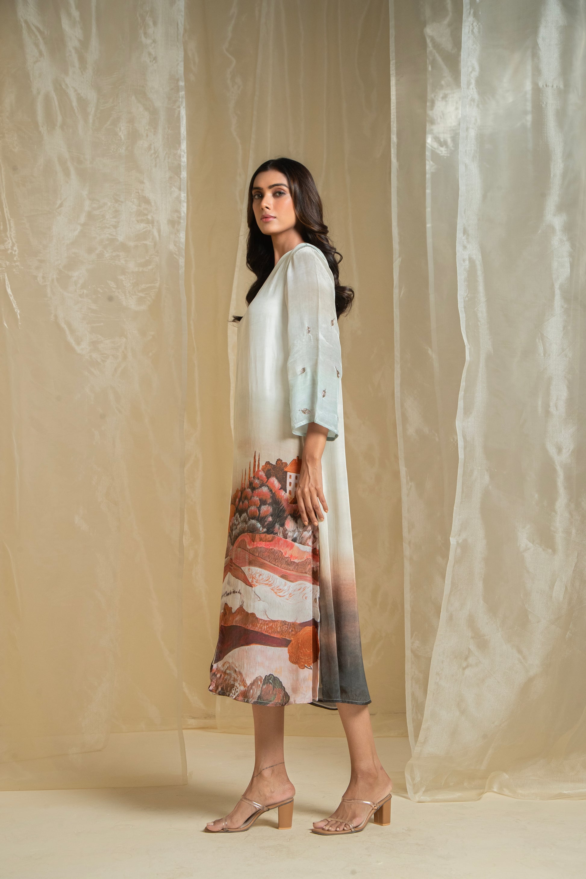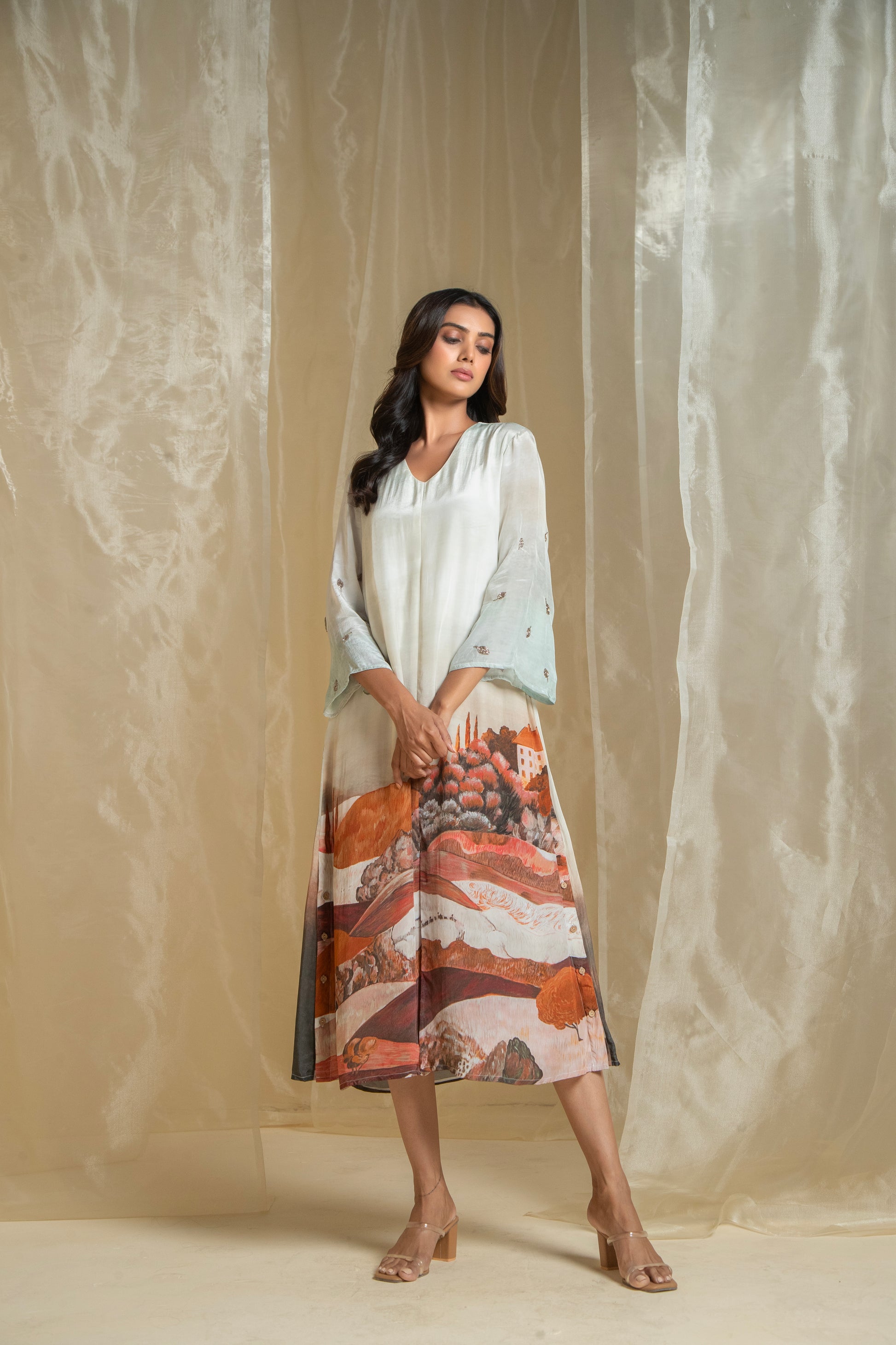 For women, the Lovescape A-Line Dress is a masterpiece of love and craftsmanship. This dress brings the serene beauty of nature to life with its mountain-inspired print, narrow V-neckline, and bell sleeves adorned with delicate hand embroidery. The center cut near the hem adds a touch of flair, perfect for special moments like a brunch or a relaxed day at a resort. Fully lined for ultimate comfort, this dress wraps you in the love and passion that goes into every detail.