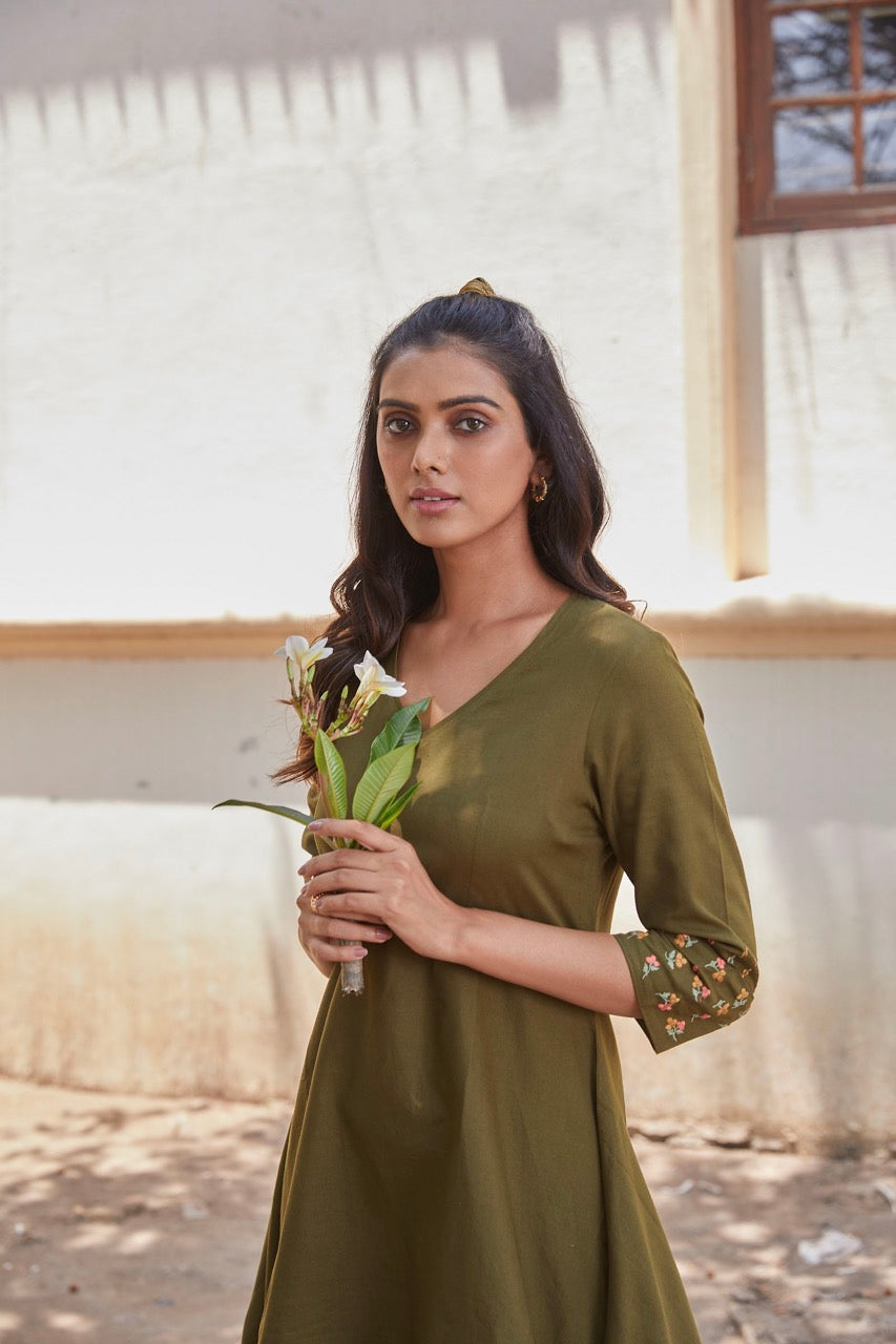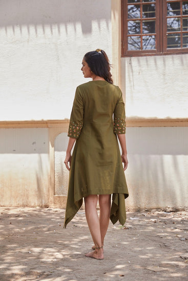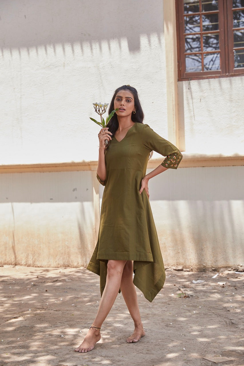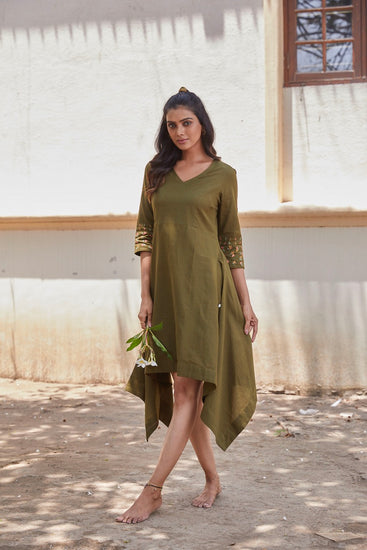 Olive green asymetrical dress pattern with thread detailingson sleeve, is every body type and you can pull this off on your holiday or your spa day.Wear your favourite tie up sandals and flaunt it.
